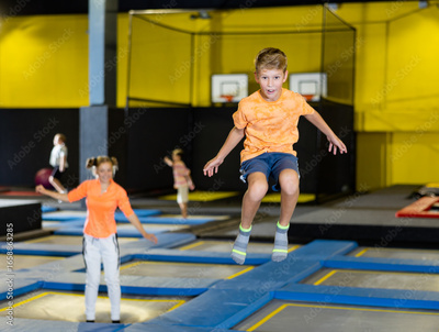 Happy active emotional preteen boy bouncing on trampoline while having fun in indoor amusement park..