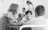 Portrait of cute smiling preteen schoolgirl discussing with his classmates assignment given by teacher during lesson at school. Pupils divided into groups. Teamwork concept