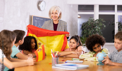 children listen with interest to the teacher, who talks about the geographical location Spain