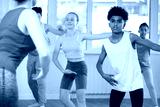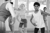 African American teenage amateur ballet dancer, dressed in yellow t-shirt and black leggings, mimicking instructor dance moves with focused precision during group class..