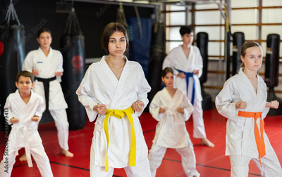 Group of children of different ages at a karate class. Teenage children master self-defense techniques