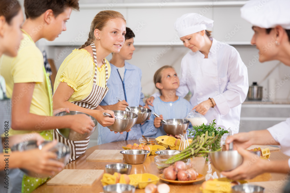 Positive interested teenage girl participating group culinary class for kids, engrossed in cooking process and talking friendly to other participants