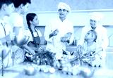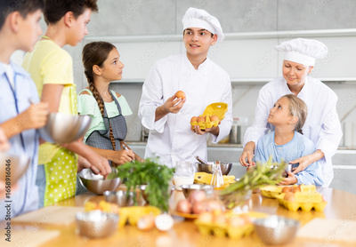 During lesson in cooking courses, male cook professional tells children about rules ticks and tricks for making fluffy pancakes, woman assistant helps hesitant child mix ingredients in bowl