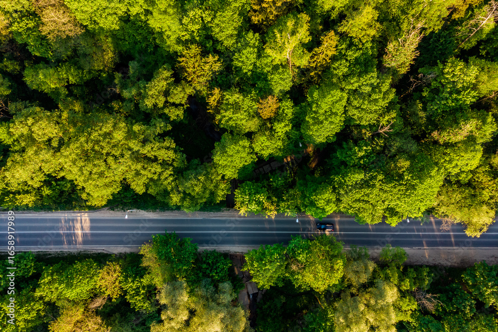 Asphalt road going through forest area, aerial view