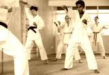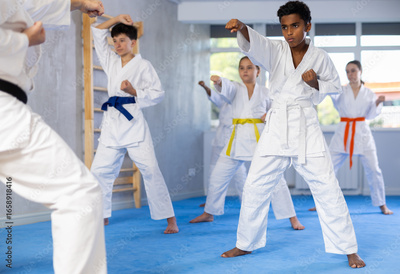 Concentrated black teenager in kimono practicing punches in gym during group martial arts workout. Shadow fight, combat sports training concept..