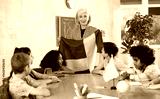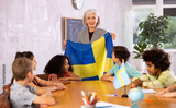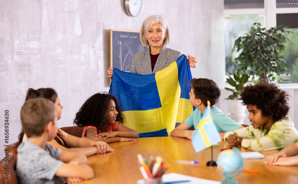 High school teacher tells pupils about Sweden and holds the national flag of the country in her hands