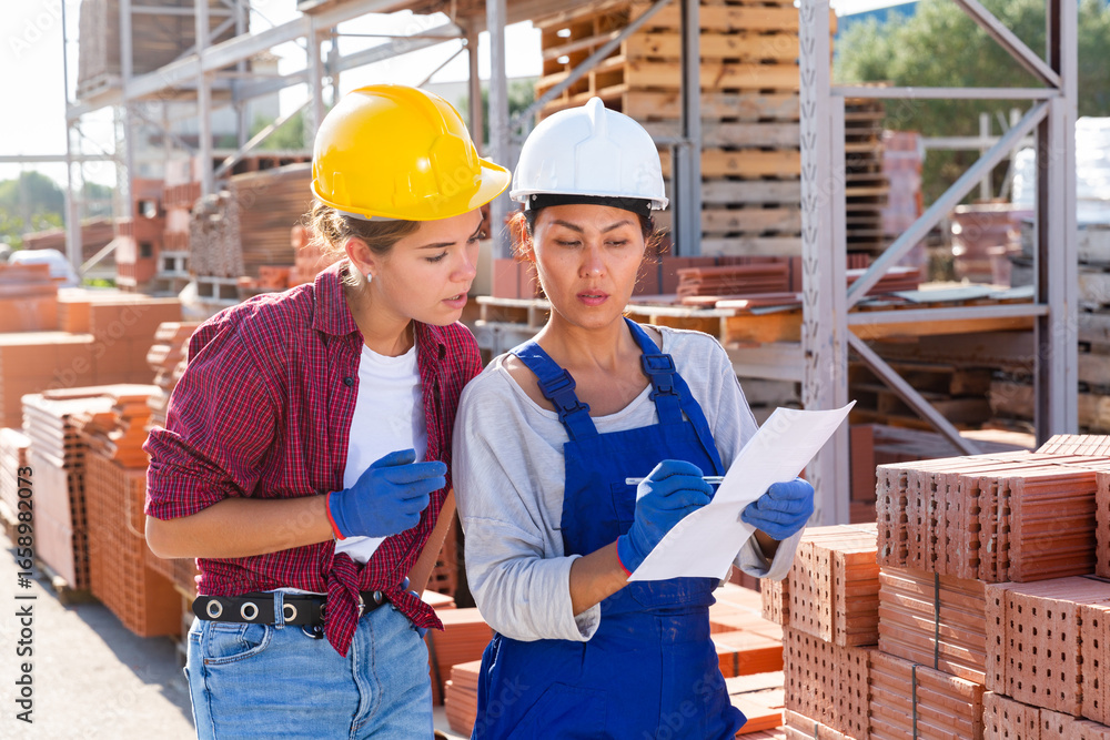Two female storekeepers working in a building materials store are discussing important work issues in the warehouse, holding ..an estimate in their hands