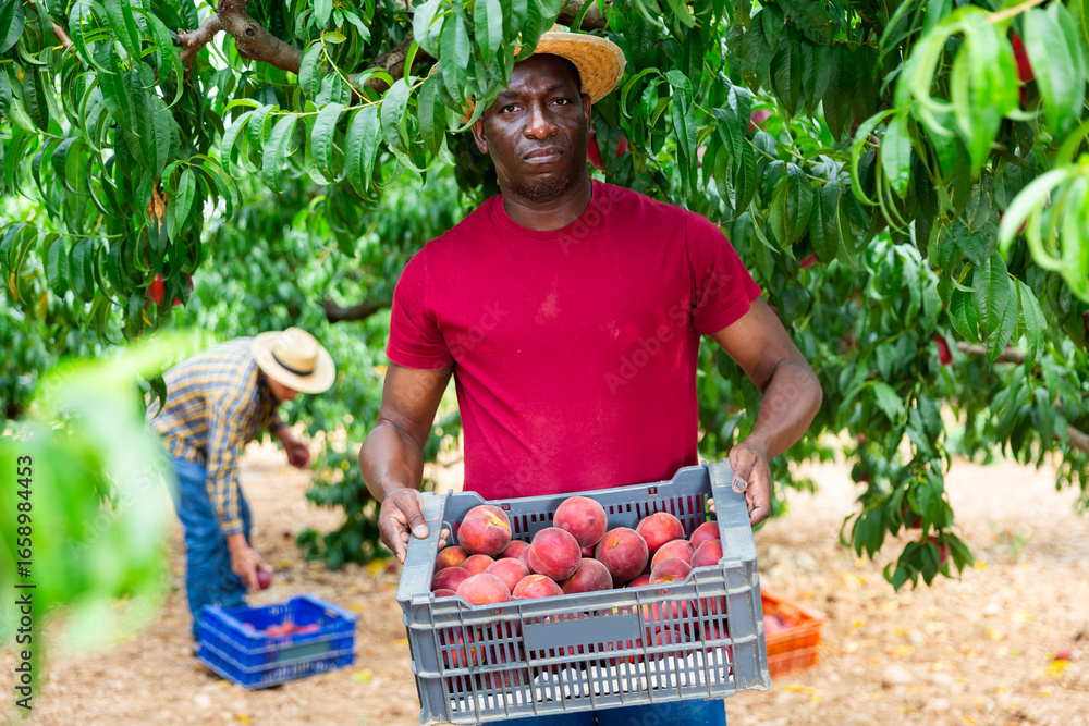 African american farmer carrying plastic box full of ripe peaches in orchard