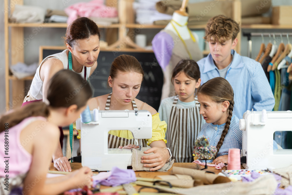Female teacher demonstrates how to sew on a sewing machine. Children gather around and watch