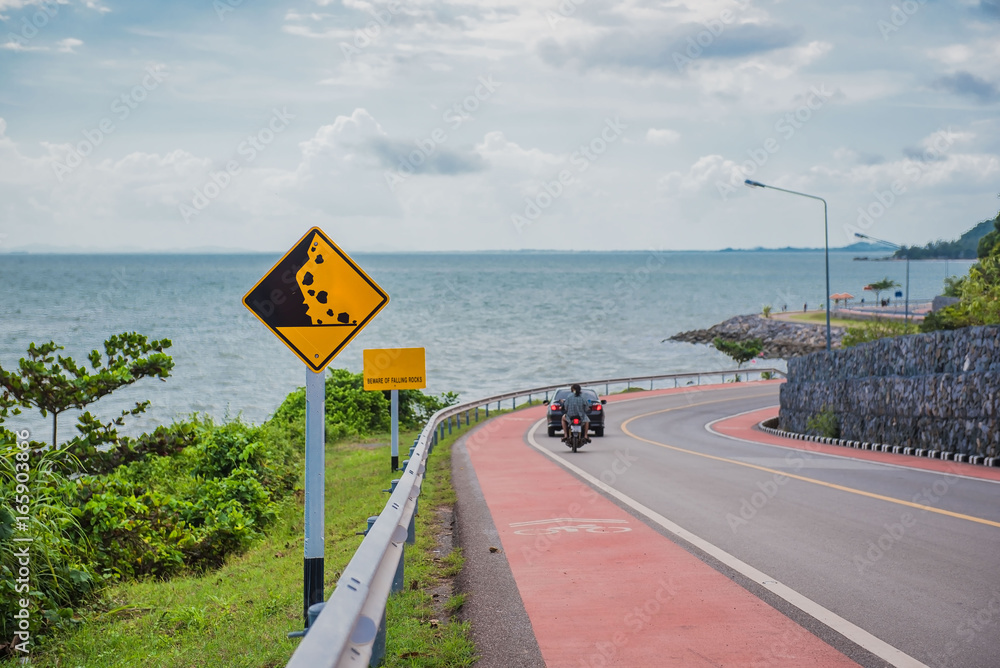 Yellow sign with beware of falling rocks symbol in the countryside sea and sky background .