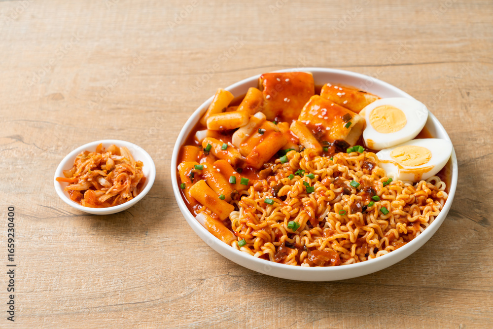 Korean instant noodles with Korean rice cake and fish cake and boiled egg