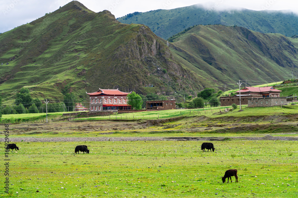 landscape of yak, pasture, village houses and mountain