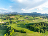 Aerial view of rural landscape in Swiss canton of Fribourg. Hills and forests in evening sunlight in district of Sense.