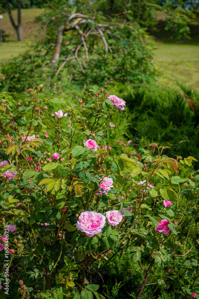 Soft pink roses bloom amidst lush green leaves, embodying spring's beauty in a tranquil garden