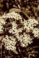 Soft pink elderflower blossoms emerge gracefully from dark green leaves under bright sunlight