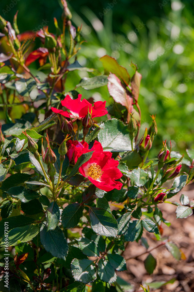 Bright red blooms shine in the sunlight, framed by fresh green leaves and budding roses