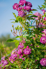 Lush pink roses thrive on a sunny afternoon, showcasing their beauty amidst green foliage