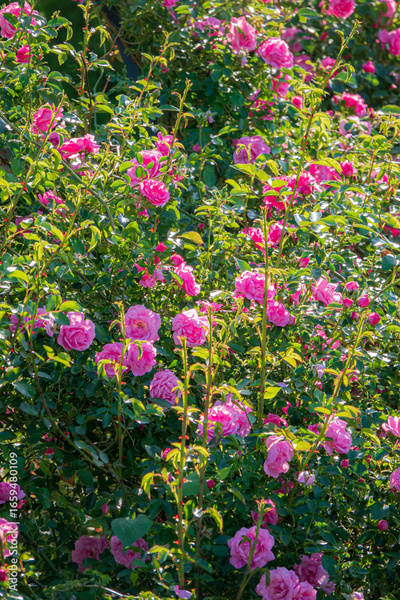 Lush greenery surrounds a stunning display of pink roses embracing the sunlight joyfully