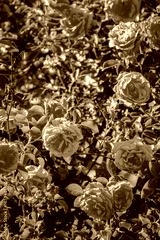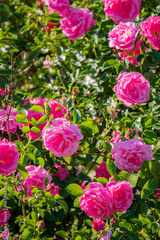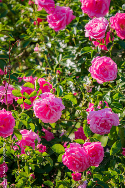 Vibrant pink roses bloom among lush green leaves in a tranquil garden