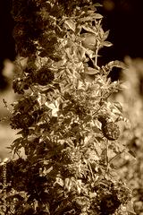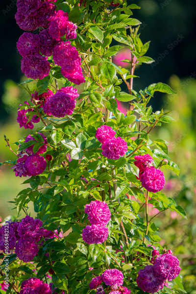 A lush display of blooming pink roses scales a trellis, soaking in bright summer sunlight
