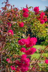 Lush pink roses flourish under the warm sun, surrounded by greenery in a vibrant garden setting