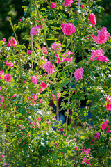 Colorful pink roses flourish amidst green foliage, creating a lively atmosphere in the garden