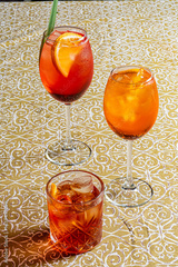 Three delicious cocktails sit on a beautifully patterned tablecloth, inviting summer enjoyment