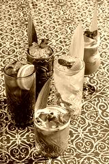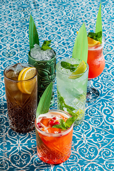 Colorful cocktails artfully displayed on a detailed blue tablecloth with fresh garnishes
