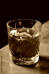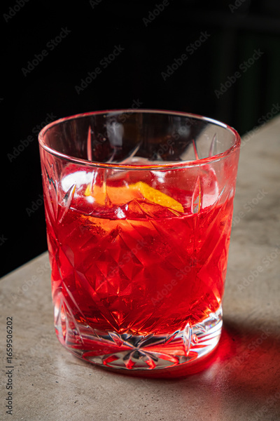 A stunning cocktail in a crystal glass boasts a rich red color and citrus peel garnish