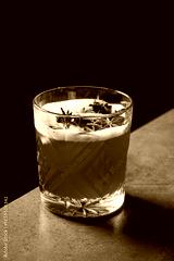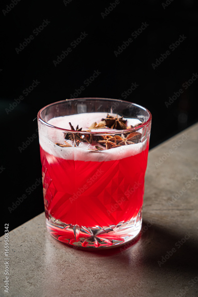 A vibrant red cocktail featuring star anise captures the mood of a lively bar atmosphere