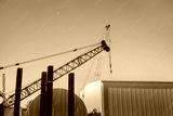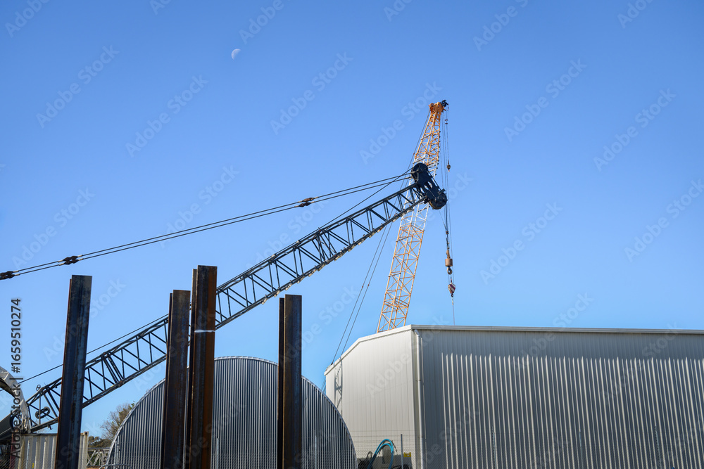 Construction cranes above the industrial tin shed. Moon on the blue sky. Auckland.