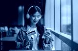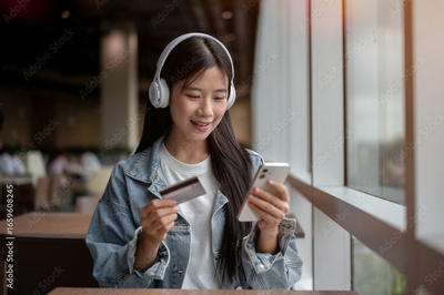 Young asian woman holding credit card and looking at phone while sitting at table in cafe or lounge.