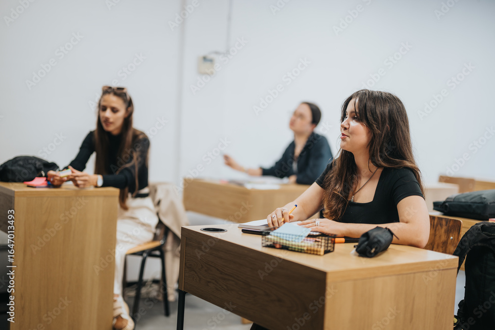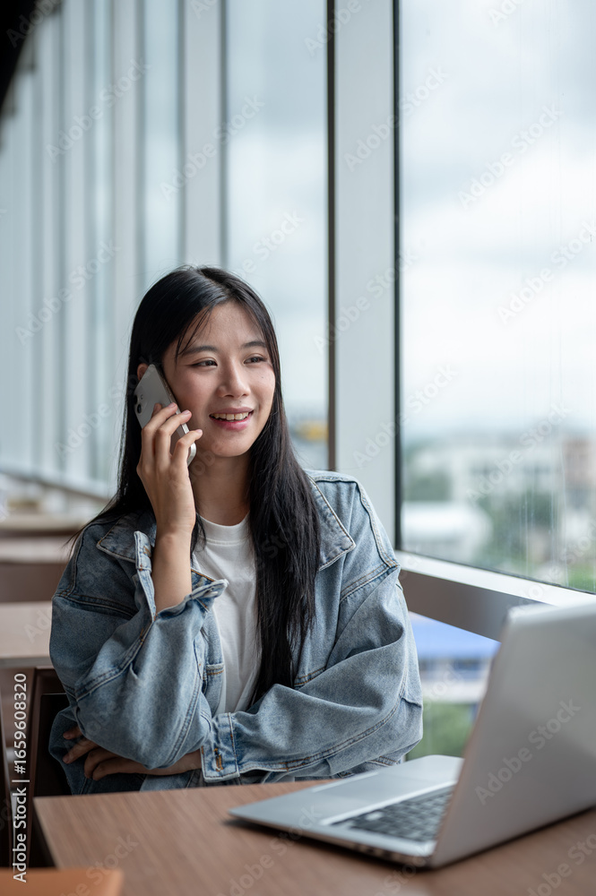 Young asian woman in denim jacket smiling as holding phone talking aside laptop on table in cafe.