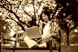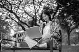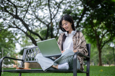 Young asian glasses woman look at laptop over crossed legs while sitting on bench in park or garden