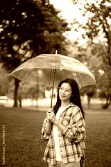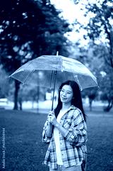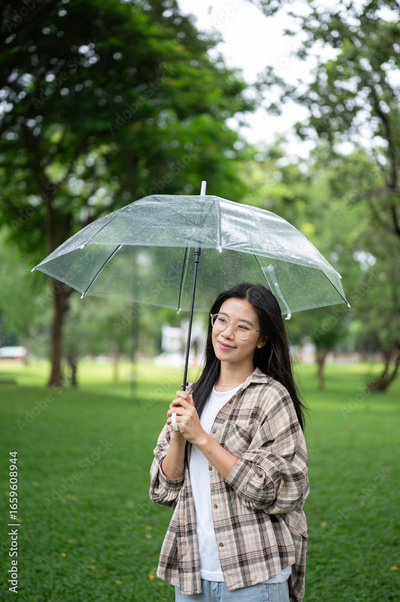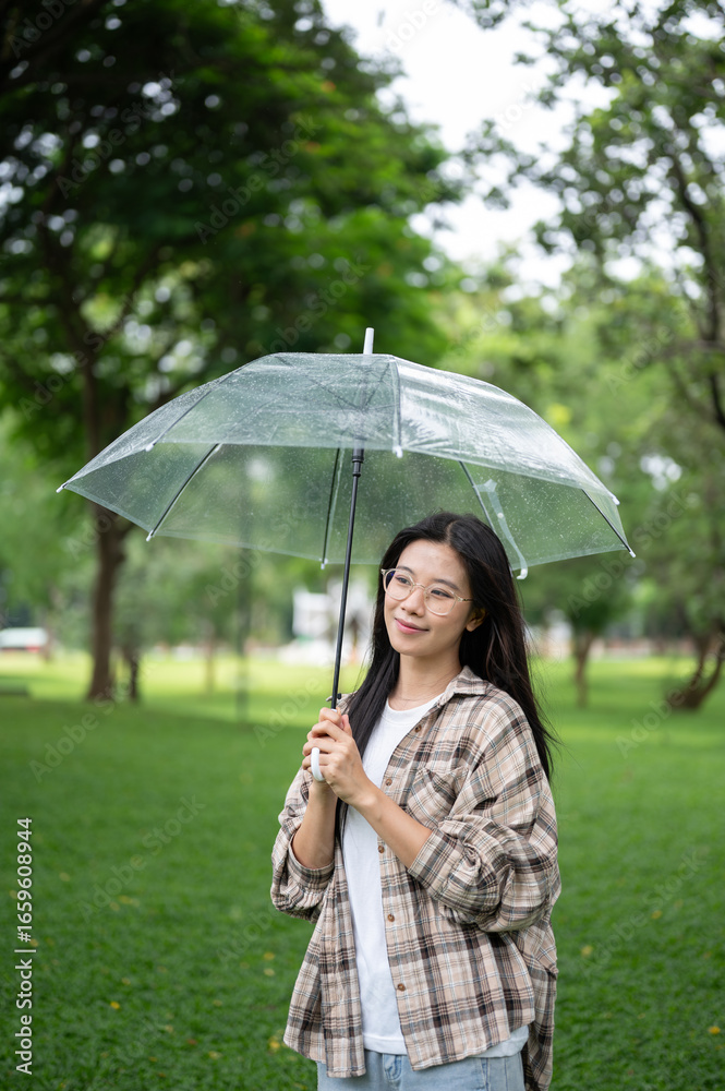 Young asian glasses woman holding transparent umbrella in the rain while standing in park or garden.