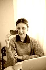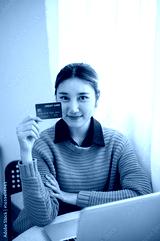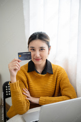 Young asian woman holding credit card and showing it to camera while sit in front of laptop on table