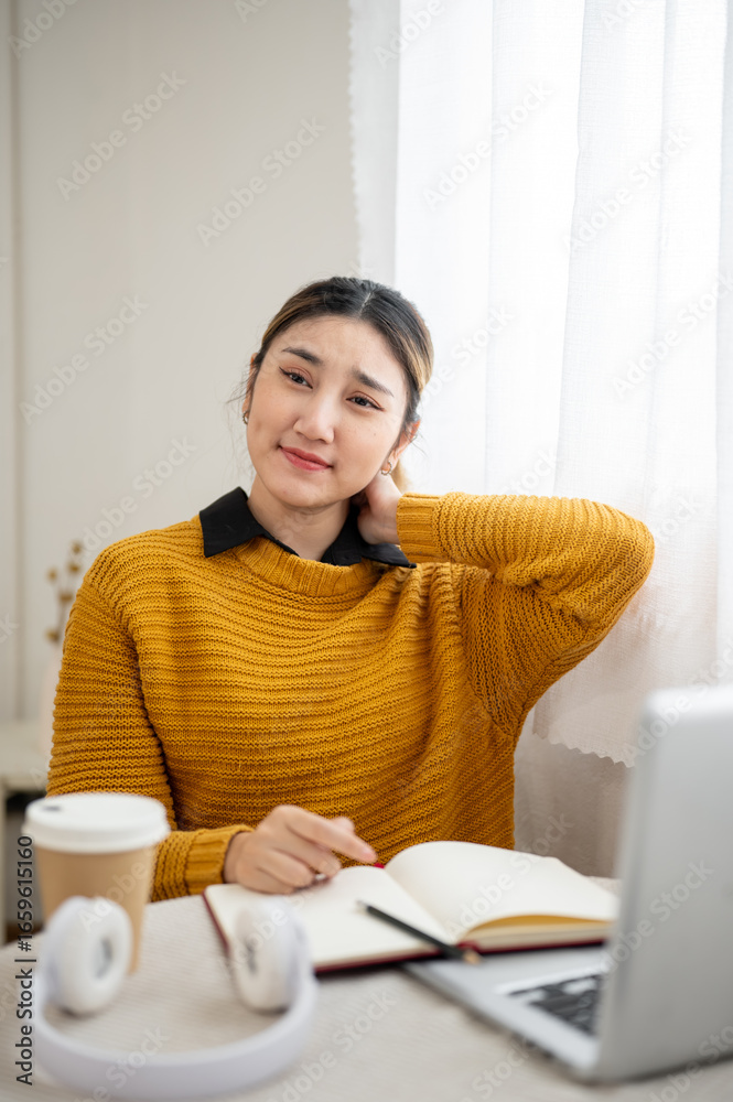 Asian woman student or office worker touching or massaging strained neck in front of laptop on table