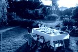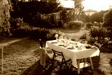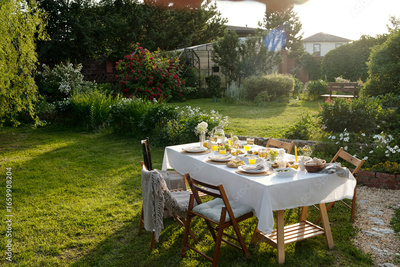 Outdoor table set for meal standing on green lawn in garden with plates, glasses, bread, fruit and flowers arranged for gathering, empty wooden chairs surrounding table