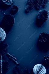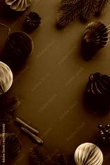 Top vertical view of Christmas decorations featuring ornaments, pine branches, cinnamon sticks, and berries