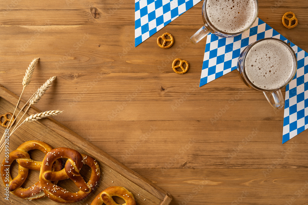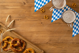 Festive Oktoberfest arrangement showcasing beer, pretzels, and decorations on a flatlay above view rustic wooden table