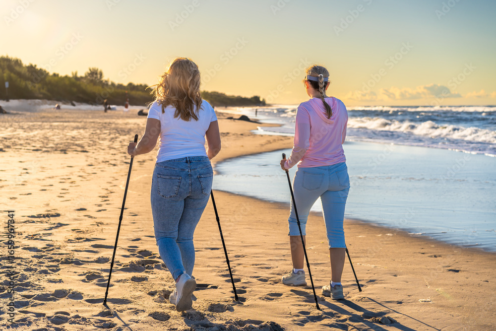 Two mature women training Nordic walking on sandy beach on summer afternoon. Back view