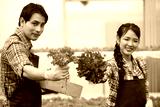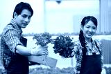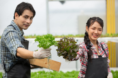 Young Asian man and women farmers smiling while holding fresh hydroponic lettuce in greenhouse. Concept of teamwork, clean food, organic farming, sustainable agriculture, and happy farming lifestyle.