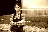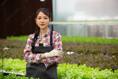 Portrait of confident young female farmer standing in hydroponic greenhouse with arms crossed. Concept of modern organic farming, clean food, agricultural leadership and smart farming.