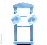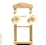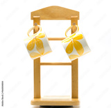 Two coffee cups is painted yellow flower outside hanging on wood hanger with minimalist style isolated on white background