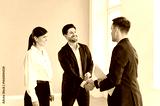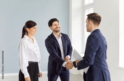Professional real estate agent showing bright new apartment to happy couple. Man and woman in suits standing in empty room, buying new house, becoming homeowners, seal deal with realtor by handshake.