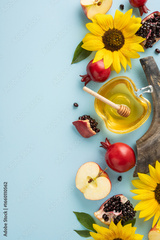 Flat-lay vertical arrangement featuring apples, honey with a dipper, pomegranates, and bright sunflowers, symbolizing Rosh Hashanah and Jewish New Year traditions and celebrations