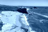Panther Beach in Cotoni-Coast Dairies State Beaches, California. Aerial view of golden sand, dramatic cliffs, turquoise waves, and scenic shoreline near Highway 1 under a bright blue sky