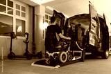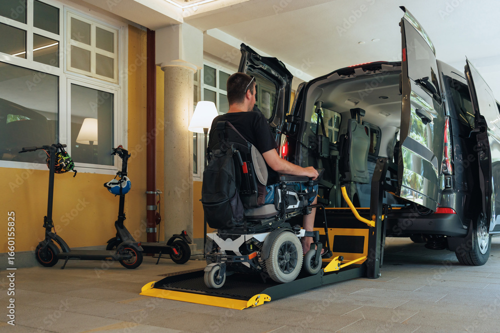Person with disability accesses a van using a wheelchair lift in a parking area. The setting is urban and designed for inclusivity.