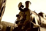 Chimney of a steam locomotive with a spotlight against the sky, an exhibition of old locomotives. Copy space for text