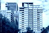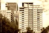 Modern residential building in Montreal with large windows and balconies, located in an urban environment with other buildings in the background and vegetation in the foreground
